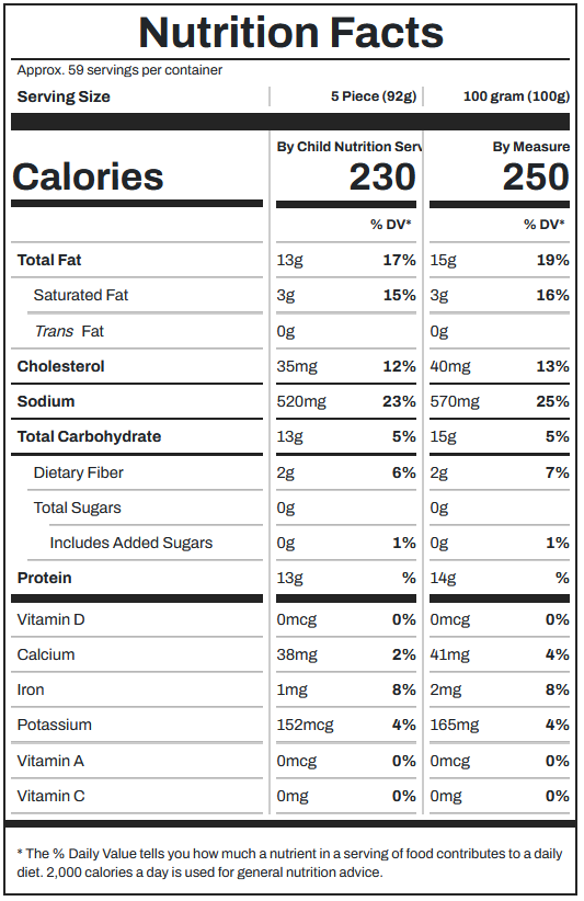 INGREDIENTS: Chicken Breast With Rib Meat, Water, Isolated Soy Protein, Salt, Sodium Phosphates, Seasoning (Salt, Garlic Powder, Spice, Soybean Oil). Breaded With Enriched Bleached Wheat Flour (Niacin, Reduced Iron, Thiamine Mononitrate, Riboflavin,Folic Acid), Water, Yellow Corn Flour, Food Starch-Modified, Spices, Dried Onion, Iodized Salt, Dextrose, Leavening (Sodium Acid Pyrophosphate, Sodium Bicarbonate), Whey, Paprika Extract (Color), Soy Flour, Sodium Alginate, Nonfat Milk, Natural Flavor, Egg.