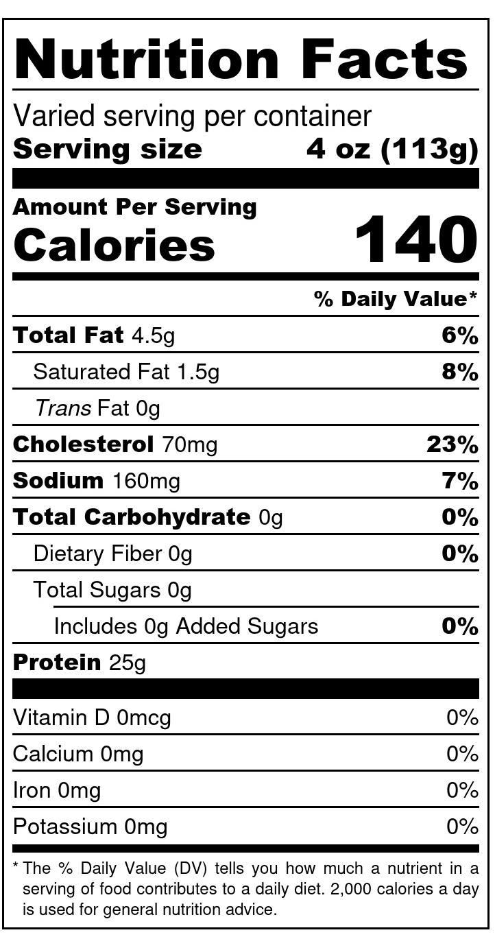 Breast with the ribs and skin left on. One whole breast split makes two halves. One half weights roughly 3/4 lb. Price break available for purchase of 10 lb. or more.