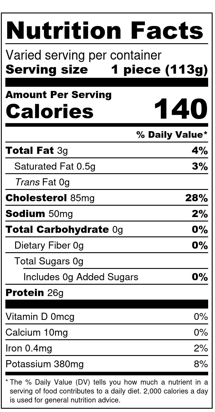 Boneless and skinless breast cutlets. Roughly 1/4″ thin. Great for frying for baking. Roughly 3-4 pieces to a lb. Price break available for purchase of 10 lb. or more.