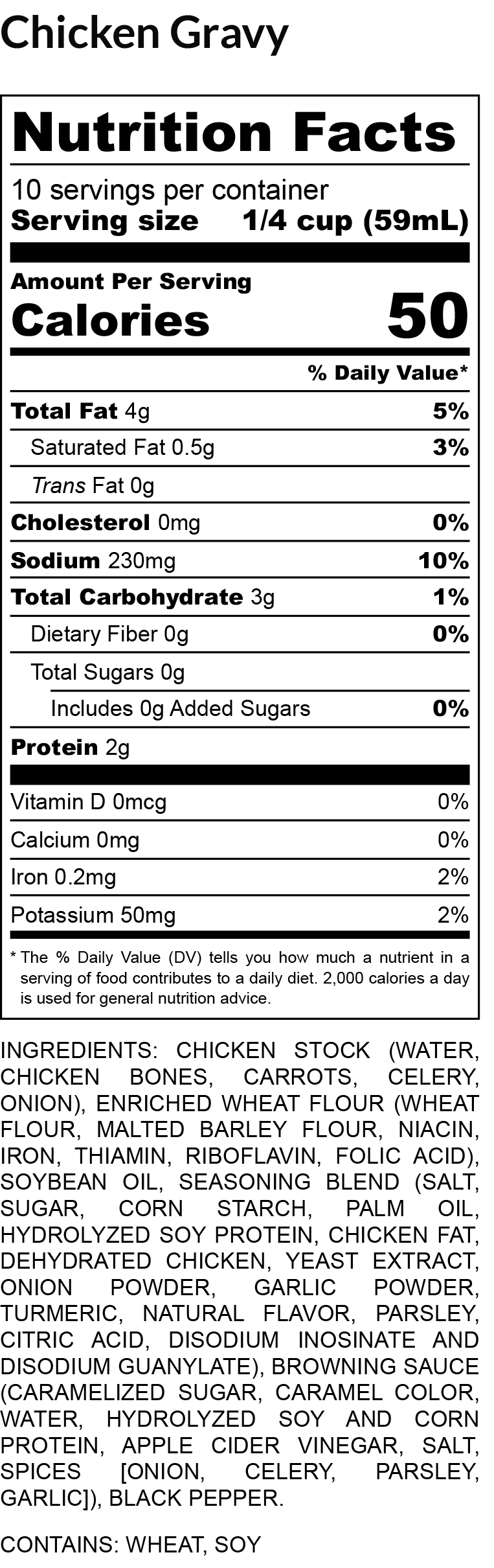 INGREDIENTS: Turkey Stock (Water, Chicken Bones, Carrots, Celery, Onion), Enriched Wheat Flour (Wheat Flour, Malted Barley Flour, Niacin, Iron, Thiamin, Riboflavin, Folic Acid), Soybean Oil, Seasoning Blend (Salt, Sugar, Corn Starch, Palm Oil, Hydrolyzed Soy Protein, Chicken Fat, Dehydrated Chicken, Yeast Extract, Onion Powder, Garlic Powder, Turmeric, Natural Flavor, Parsley, Citric Acid, Disodium Inosinate and Disodium Guanylate), Browning Sauce (Caramelized Sugar, Caramel Color, Water, Hydrolyzed Soy and Corn Protein, Apple Cider Vinegar, Salt, Spices [Onion, Celery, Parsley, Garlic]), Black Pepper.