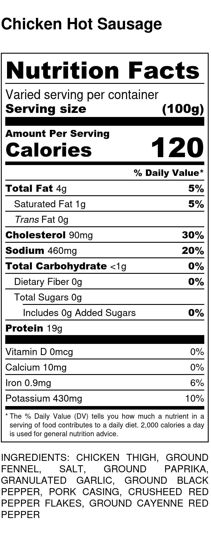 Hot Italian style chicken sausage. Ingredients: Chicken, fennel, salt, black pepper, cayenne, crushed pepper, garlic, paprika. Made with natural pork casing.