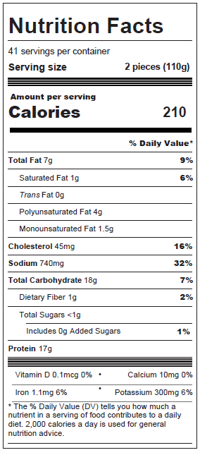 Starch, Sugar, Salt, Leavening (Sodium Acid Pyrophosphate, Sodium Bicarbonate), Yeast Extract, Spices (Including Celery Seed), Yellow Corn Flour, Soybean Oil (As a Processing Aid), Extractives of Turmeric And Paprika, Natural Flavor. Predusted With: Wheat Flour, Wheat Gluten, Salt, Soybean Oil (As a Processing Aid). Breading Set In Vegetable Oil.