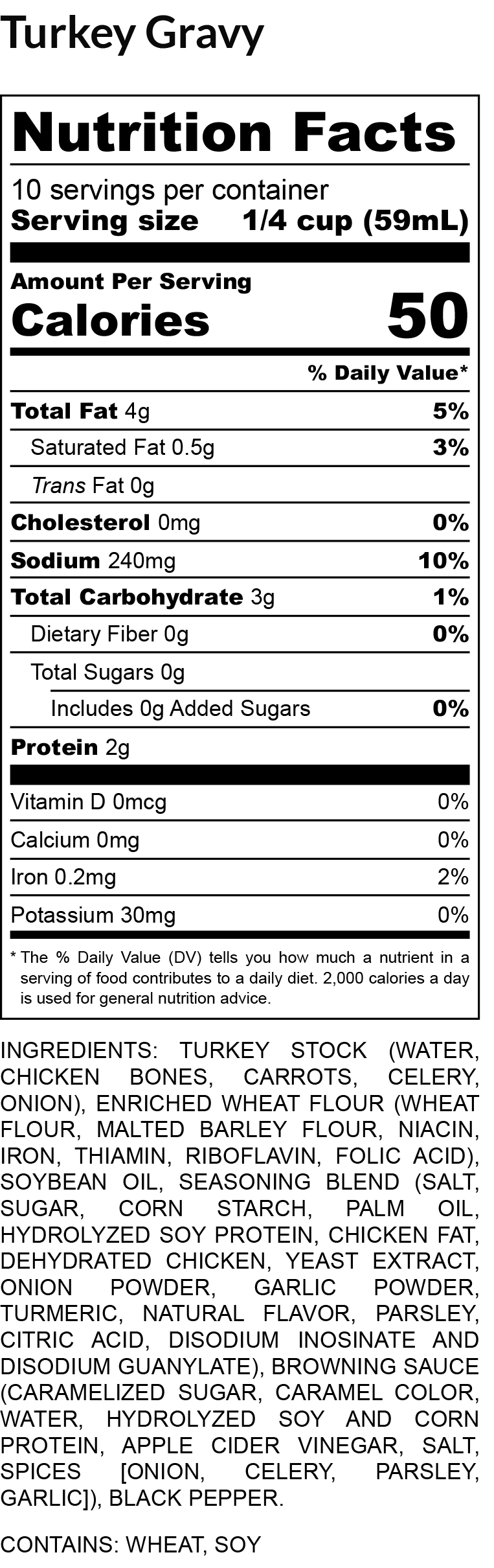 INGREDIENTS: Turkey Stock (Water, Chicken Bones, Carrots, Celery, Onion), Enriched Wheat Flour (Wheat Flour, Malted Barley Flour, Niacin, Iron, Thiamin, Riboflavin, Folic Acid), Soybean Oil, Seasoning Blend (Salt, Sugar, Corn Starch, Palm Oil, Hydrolyzed Soy Protein, Chicken Fat, Dehydrated Chicken, Yeast Extract, Onion Powder, Garlic Powder, Turmeric, Natural Flavor, Parsley, Citric Acid, Disodium Inosinate and Disodium Guanylate), Browning Sauce (Caramelized Sugar, Caramel Color, Water, Hydrolyzed Soy and Corn Protein, Apple Cider Vinegar, Salt, Spices [Onion, Celery, Parsley, Garlic]), Black Pepper.